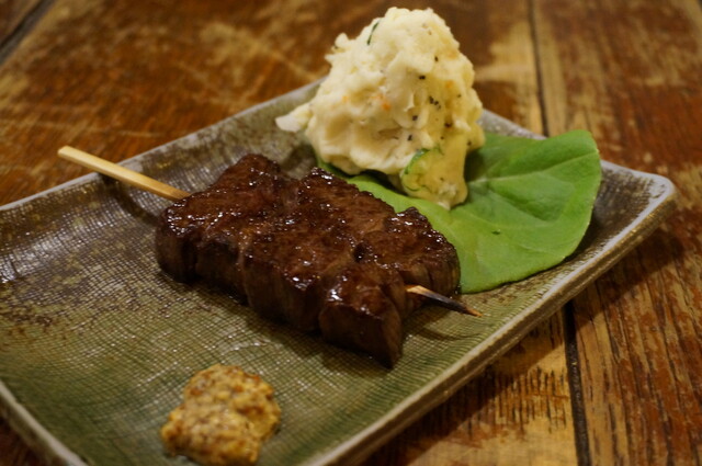 日南といえばコレ!という大名物がこの牛ハラミ串です。ステーキみたいになっていてポテサラ付き(^_^)