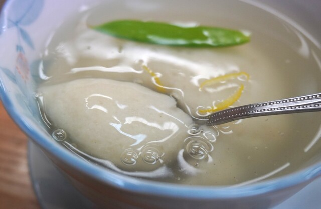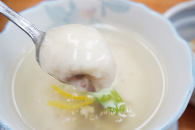 優しい旨味に溢れる葛餡にどっぷり浸ったもちもちの里芋饅頭の中には挽肉・筍・椎茸等のみじん切りが入っています。
