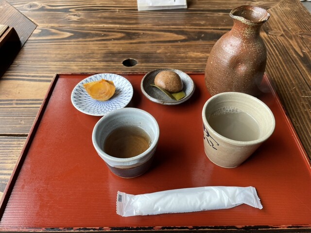 小上がりに座るとすくにお茶、出し汁などが来ました。