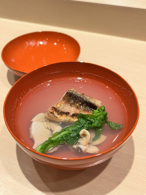握りでは金目鯛のヅケ。近藤店主のスペシャリテ・鰆のヅケを期待していたら、まさかの金目鯛!んで、コレが恋心にも似た鰆への期待感を難なく沈めて忘れさせるくらい美味いんだ。黄金色に近い透き通った身も美し~い!