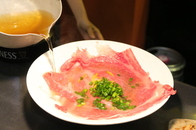 霜降りたっぷりの極上のお肉の上に、熱々のお出汁をかけていきます。