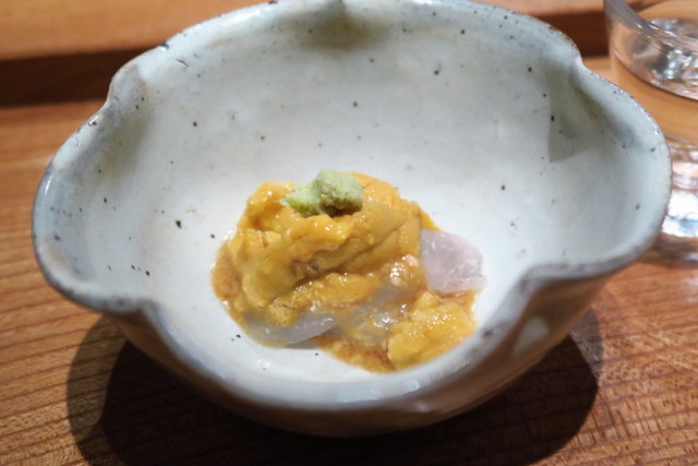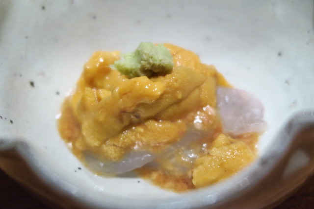 肝で和えたかわはぎの上に、生うにが乗っています。