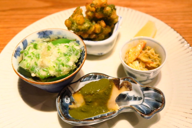 アワビの肝ソースやトウモロコシの天ぷらなど、日本酒が進むものばかり。