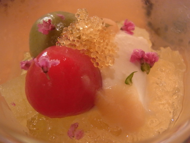 トウモロコシのムースと冬瓜のジュレ、桃のムース、などなど1つの器の中にたくさんの素材が詰まっています。