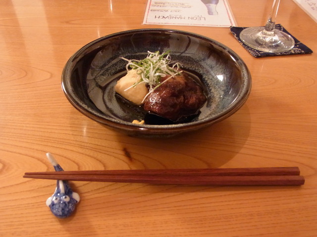 ▼「里芋の揚げ出し豆腐とセルバチコを巻いた野菜の天麩羅、生青海苔のあんで」