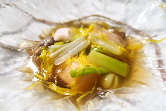 透明なセロファンのような包みは、耐熱性があるので、食材を包んでそのまま調理できるという優れもの。