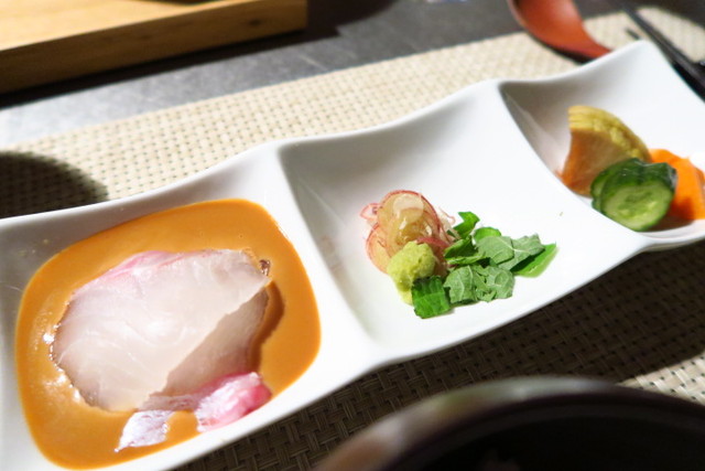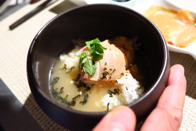 鯛に少しだけ火が通り、甘みが増しておいしい鯛茶漬けの完成。こんなスタイリッシュな空間でいただく鯛茶漬けが斬新。なんだかほっこりします。