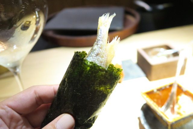 手渡しされたのは、北海道の本ししゃもと芽葱を海苔で巻いたもの。