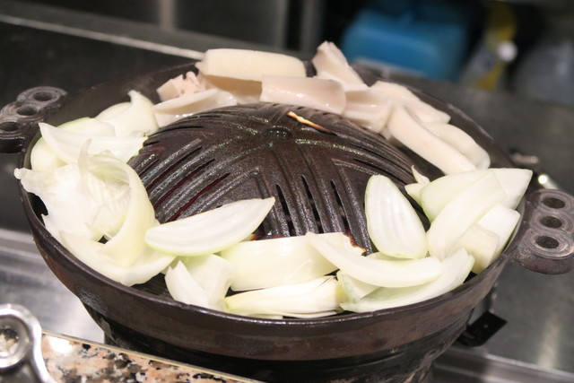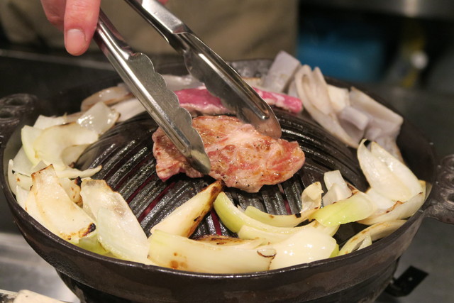 まずはたっぷりの玉葱と茨城産の蓮根を鉄板の上で焼いていきます。