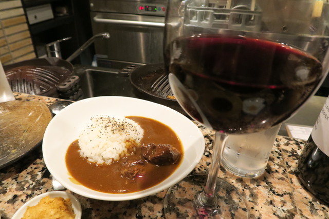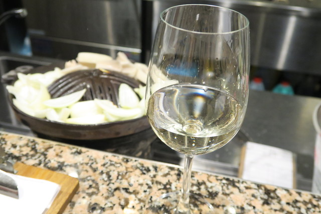 白ワインを飲みながら、目の前で焼いて頂く技を眺めるハツ。