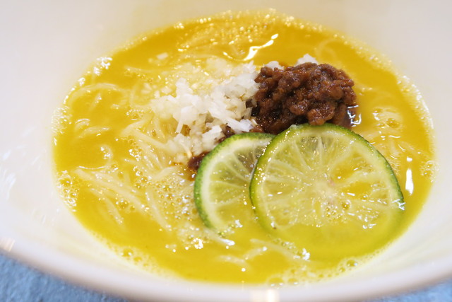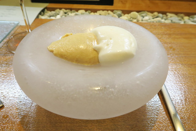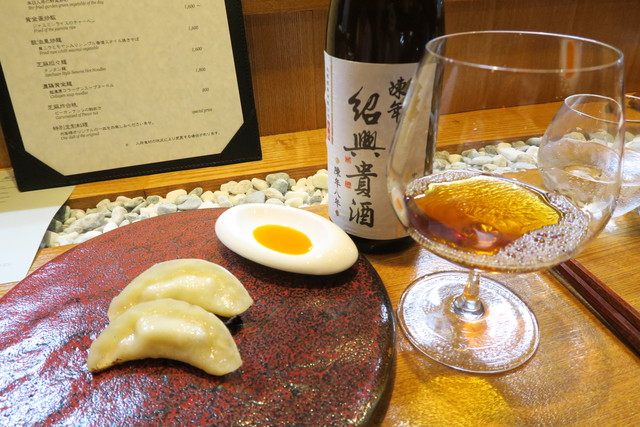 ねっとりとした食感に合わせるのはラー油パウダーと紹興酒の泡。