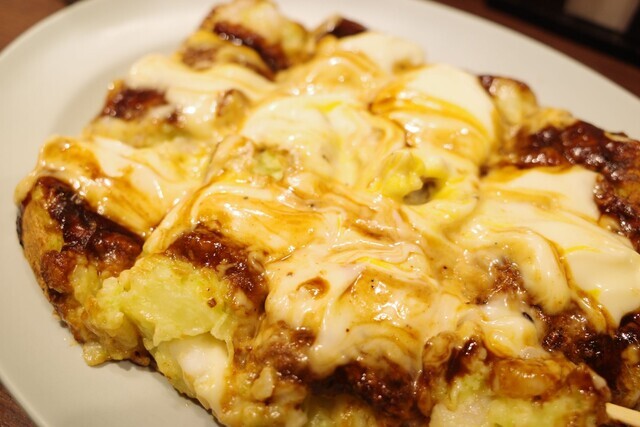 外も中もふわっふわで、じっくりかけて焼き上げている理由がわかります。ふわとろでクリーミーな食感は飲めるお好み焼きですね。