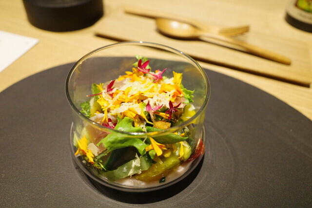 コースは季節ごとに一新。イタリアンやフレンチ、そして和食のエッセンスを融合させた、ジャンルの枠にとらわれない構成。