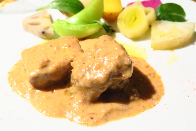 ソースはバルサミコに、サフラン風味のクリームソース。