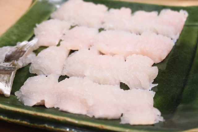 それが、鱧の骨切りの音。一定の間隔で鳴り響く音はさすが、職人技。うっとりです。