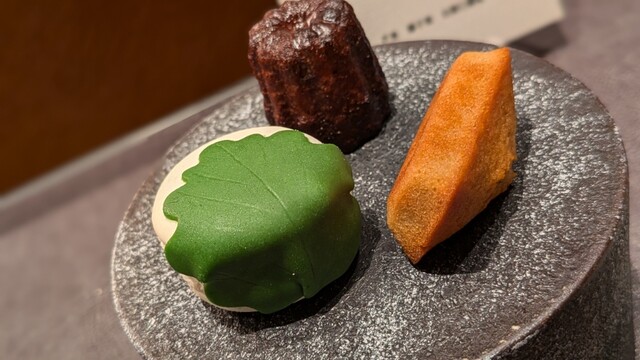 また、この日にいただいた新しいお皿では、シェフの意気込みも感じられる色鮮やかな白・緑・桃のドットが映える「心機一転」が印象に残りました。上野シェフといえば、目にも美しい一皿での表現が特徴的。幾何学的な表現はアラン・デュカスでの経験でしょうか。そして三色ドットの下の茄子のピューレがひかれた下には蝦夷鮑とバフンウニが眠っています。鮑・雲丹といえば、ついつい写真映えのために表に出してしまいそうなところをしっかりとムースの下に仕込んでいるのがシェフらしい。そして、ペアリングの Domaine Gresser Grand Cru Kastelberg Riesling 2007。こちらもリースリングとは思えない甘さ抑えめのすっきり果実み推しのタイプで、しっかりと料理を支えていました。どちらからも表面からは見えない内に秘める情熱やイズムを感じる内容で、それらがシェフを想起させて個人的には楽しかった。こういったシェフの人柄やお店の成り立ちも楽しめる方にはとても刺さるお店だと思います。