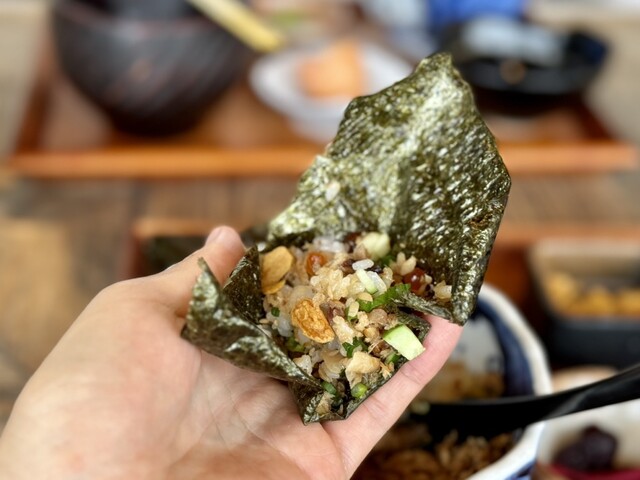 朝食なら金目鯛の煮汁と半生かつお節の「卵ごはん」、濃厚魚介風味の「漁師汁」がド定番。