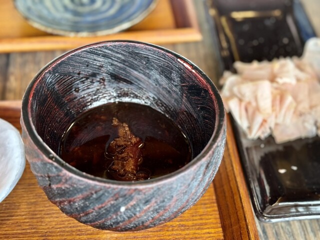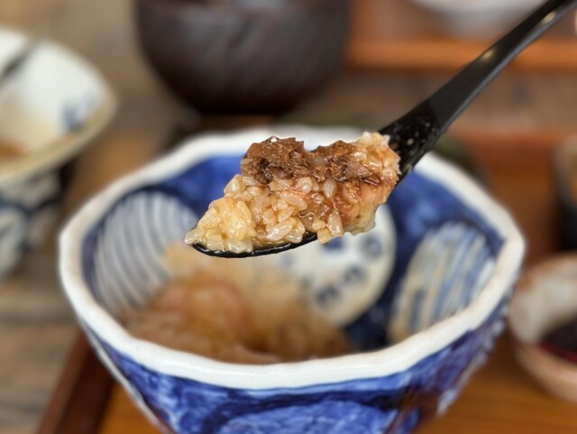 お醤油の代わりに煮魚と半生かつお節で食べる名物卵かけご飯