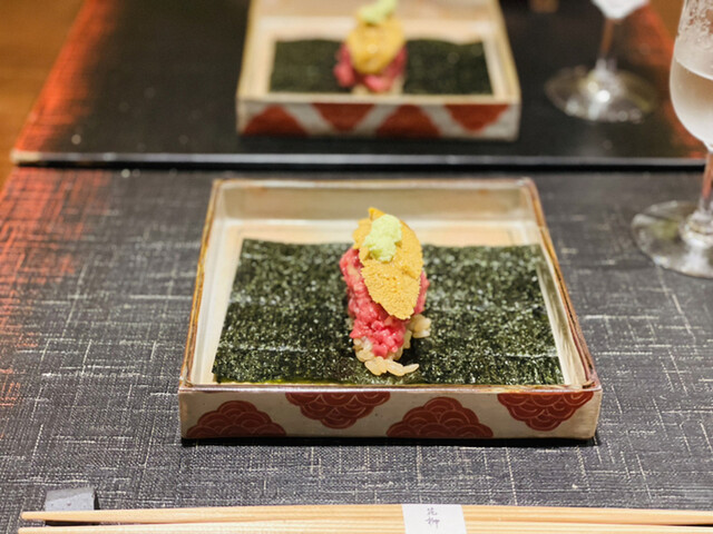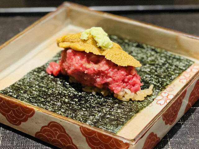 和牛クラシタの軽い炙り 北海道産 生雲丹巻き 天山葵