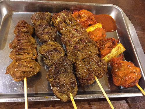 串焼きはタンドリーチキン、ビーフ、鶏レバー、砂肝の4種類あります。