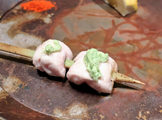最初に供された野菜スティックと手作り味噌は、口直しとしての役割もあり、コースの流れの中で良いアクセントになっていました。続いて、鶉、白肝淡雪塩掛け、手羽先、椎茸、くるみねぎ、はつ、白肝胸巻き刺し、銀杏、笹見、砂肝と続き、〆はそぼろ卵ごはんでした。以前は焼き方がいましたが、現在は店主自らが炭火で焼き上げていて、炭を起こすタイミングにまで気を配る姿勢が伝わりました。焼き上がった串はいずれも完成度が高く、素材の持ち味が端正に引き出されていました。なかでも鶉は格別で、他店ではなかなか出会えない仕上がりだと思います。手羽先の香ばしさも印象的で、焼き加減の妙を存分に味わえました。くるみねぎ、はつ、笹見、砂肝も、それぞれの個性が際立ち、さすがと思わせる内容でした。〆のそぼろ卵ごはんは三段階で仕上げていく趣向がありました。まずは黄身を混ぜ、うずらを加え、ねぎをまぶして完成します。そぼろの味付けに卵のまろやかさが重なり、さらにうずらが加わることで甘みとコクが広がりました。最後まで満足感が続く見事な締めの一品でした。