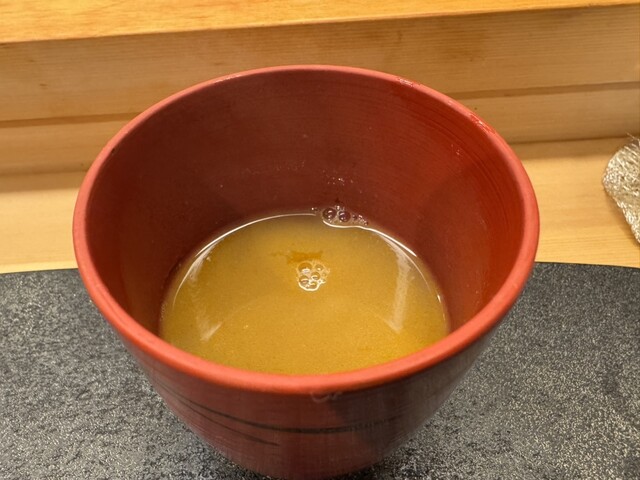この日使った魚全てから出汁をとり、仕上げに豆板醤を入れたお味噌汁。