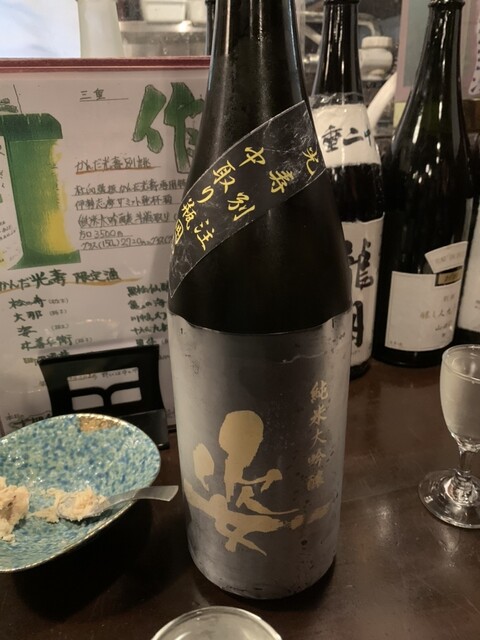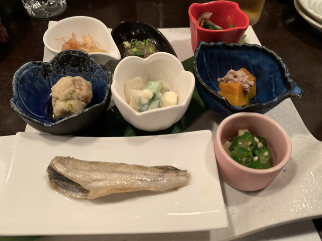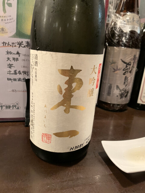 この日は先ず、あん肝煮、レバーペースト、砂肝の葱塩、雌株とろろ、鮪角煮、豚味噌、ナメコ、らっきょうの味噌漬けと言うラインナップ。