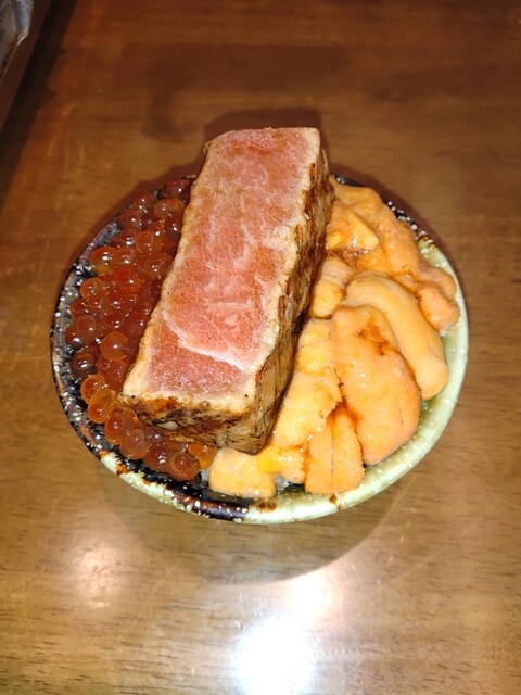 焼きうお いしかわ、名駅の大名古屋ビルヂング3Fです。久しぶりに来ました。至高の三色丼コースはいつ食べも美味しい。雲丹いくら丼の上に焼いた本マグロの大トロを専任焼き師に焼いてもらい、完成です。久しぶりに食べて美味しいことを実感しました。特に蝦夷馬糞雲丹に本鮪の大トロのせは犯罪級の美味しさです。