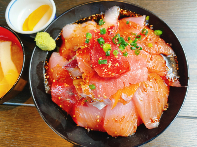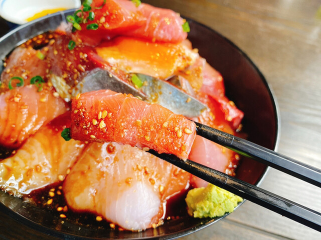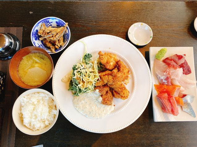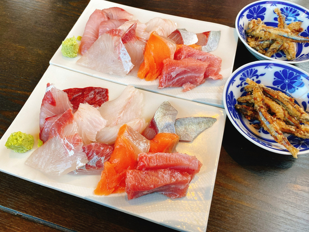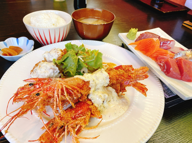今回は、海鮮丼(大)1,300円と、大エビフライがメインのCコース1,600円を注文。