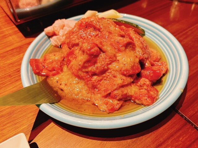 ステーキのような塊肉をハサミで細かく切りながら食べていくと…より肉肉しい味わいがお好みの方は満足頂けるかと。
