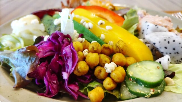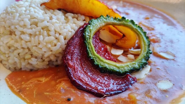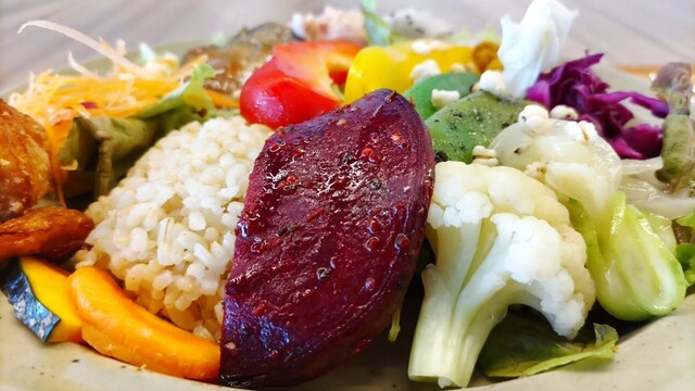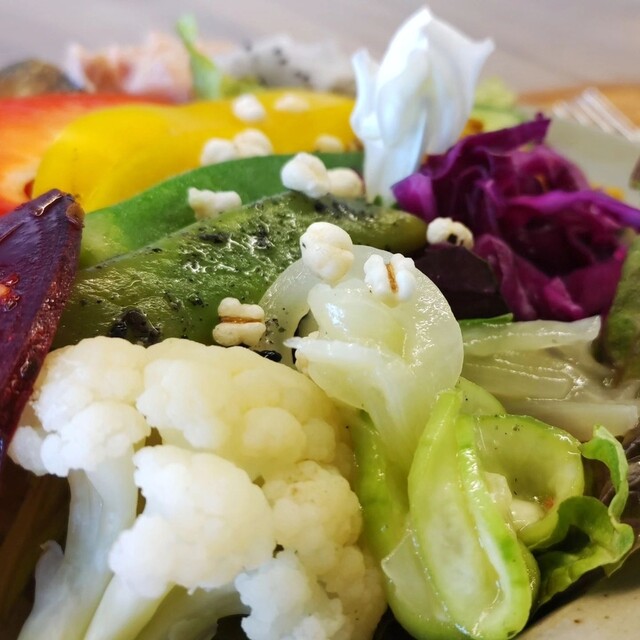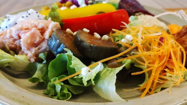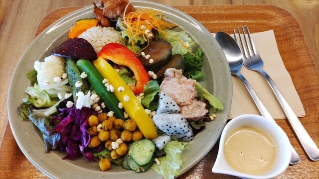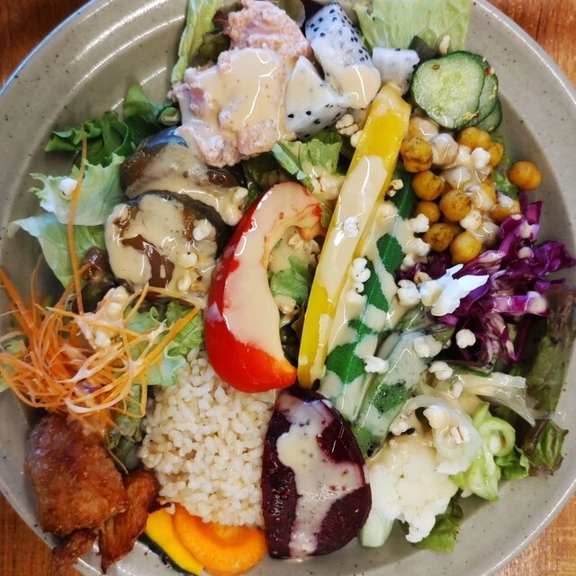 目にも美味しいカラフルな旬の沖縄野菜をふんだんに使った「樂園サラダライスボウル」。 一種類ずつじっくり味わうもよし。大胆に混ぜ合わせるもよし。 様々な食感が楽しめる、ボリュームたたっぷりのひと皿です。