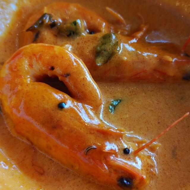 石垣島産車えびが たっぷり入ったカレー が食べられるのは 当店だけ!ピリッとした 辛さトマトとココナツのコクと香り えびのうまみがギューッと重なり スプーンがとまらない!