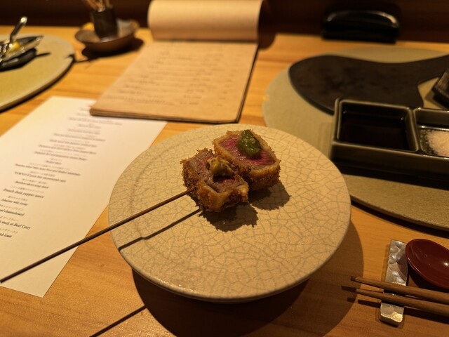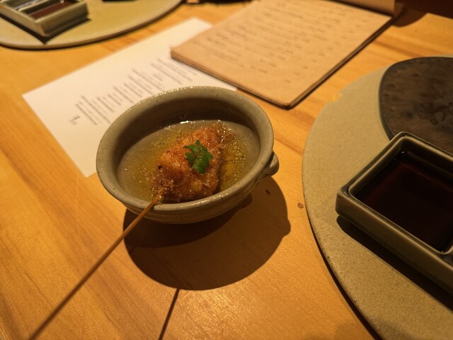 大阪といえば串揚げだよなとおもって見ていて発見したお店。別の機会にミシュラン見ていたら掲載されていて、これは行かねばと友人と。串揚げのベースをちゃんと維持しながら、各所に工夫がされている。とても揚げ物づくしとは思えないくらい食べたあとも満足。(もたれない)。味は色々な評価がされるであろうが、素材に旬のものが数多く使用されていて、年中同じ鉄板ねたを食べるイメージの串揚げとは大きく異なった。とてもいいね。