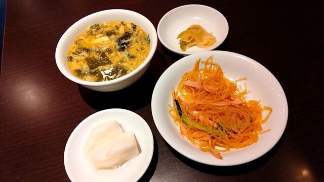 最初にセットに付く小鉢類が運ばれて来た。スープ、搾菜、大根の甘酢漬け、季節の和え物でこの日は春雨サラダ。