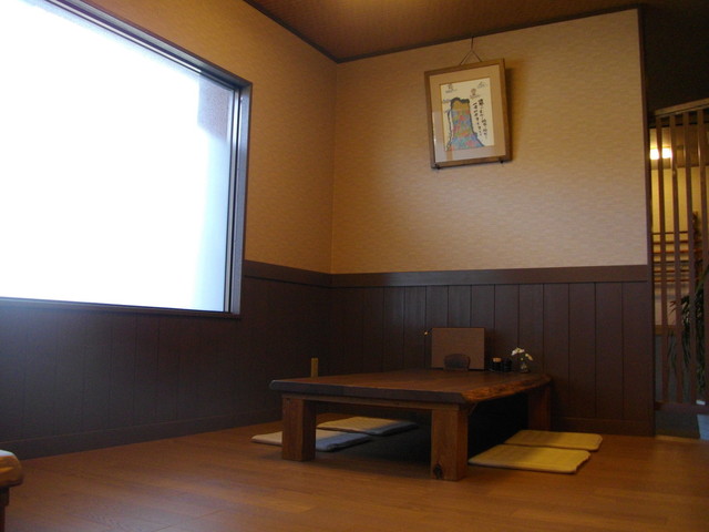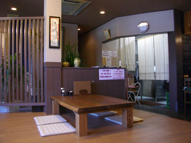 店内に入ると向かって右側にそばを打つコーナー、正面にレジがありその奥に調理場。右側にはこあがりの座敷にテーブル席が4卓と、カウンターがあります。