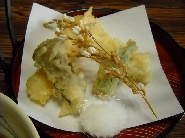 内容はサーモンのお造り、ぶりの照り焼き、茶わんむし、てんぷら、山菜ごはんです。