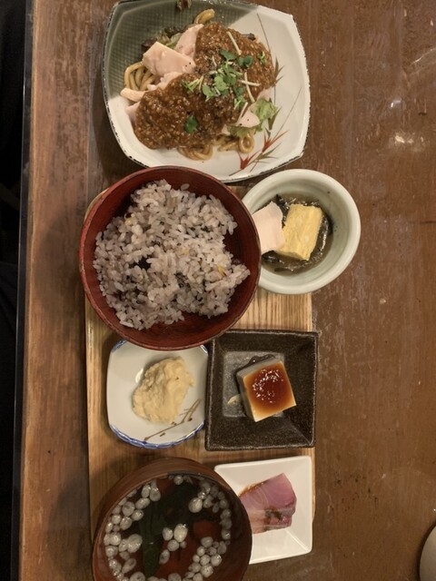 小鉢も刺身あり、豆腐、卵焼きとあんかけ?、漬物と多種。