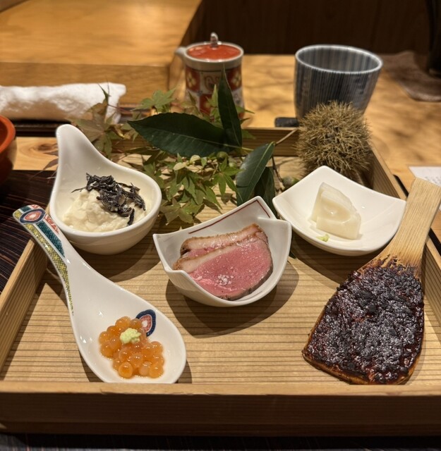 八寸には鴨、いくら、板わさ、湯葉豆腐、焼き味噌などが美しく並び、秋の枝葉や栗のあしらいまで心憎い演出。