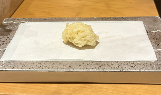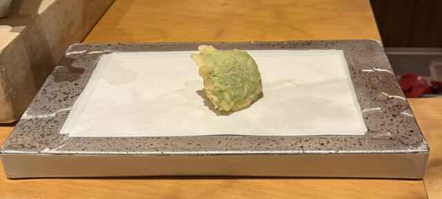 活車海老の天ぷらは外は軽やかに香ばしく、身はぷりっとした弾力。スナップえんどうやモロッコインゲンの彩りも美しい。