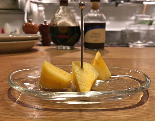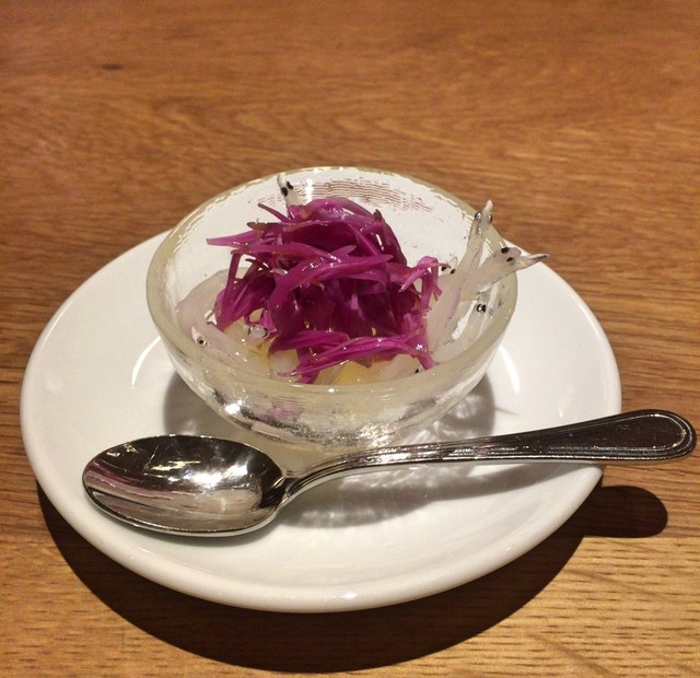 黒胡椒入りサラミ + 米沢 春菊 + 小桃の酢漬け、