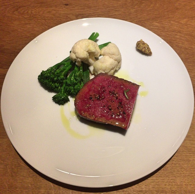 黒毛和牛もも肉のステーキ + 米沢 茎ブロッコリー + カリフラワー(アップ)