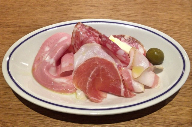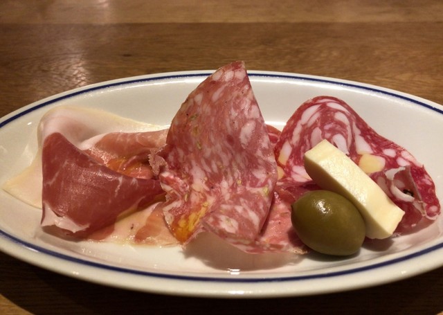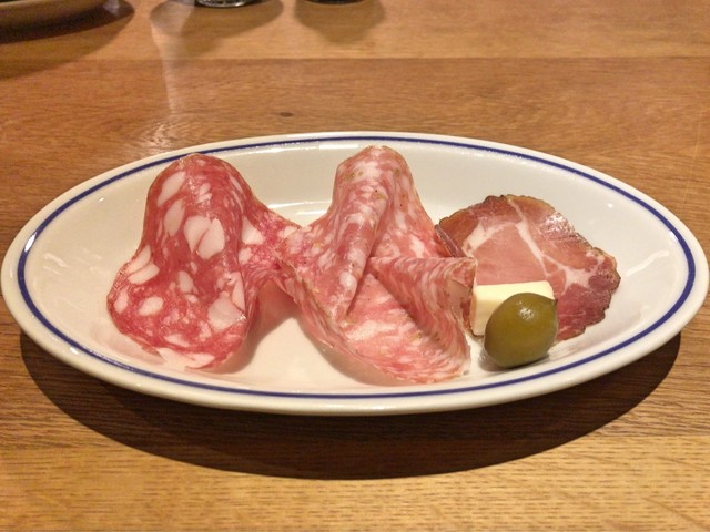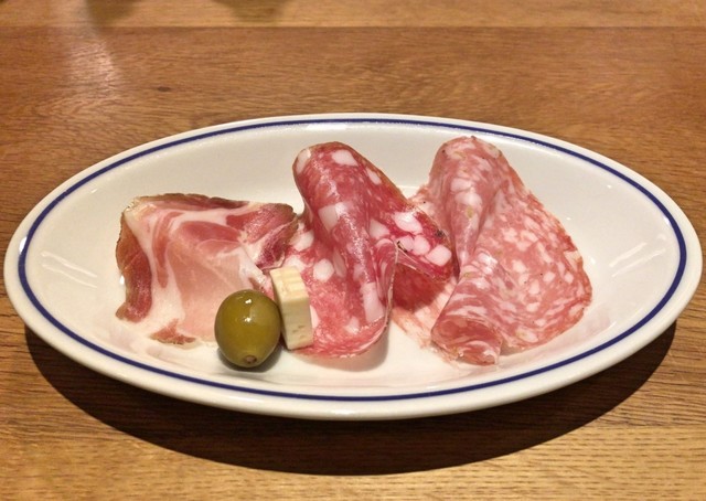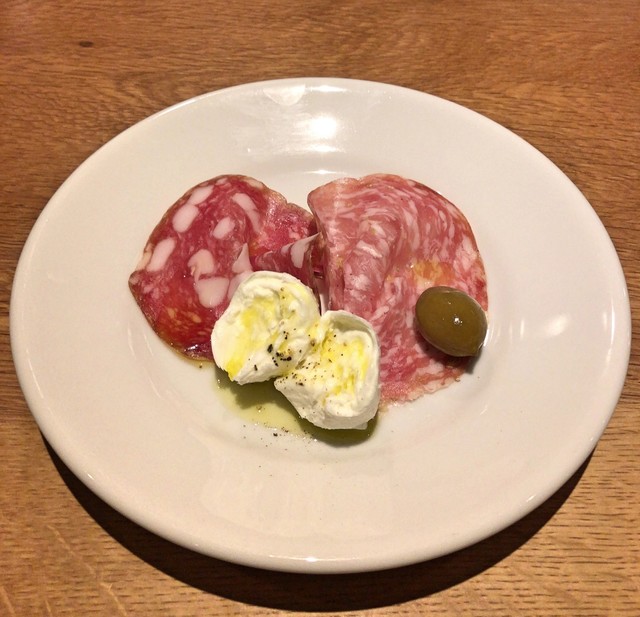 ・黒胡椒入りサラミ + フェンネルシード入りサラミ + コッパ + 小桃の酢漬け + タレッジョチーズ