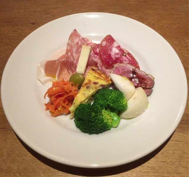 ・前菜 盛り合わせ(人参ピーナッツ + 黒胡椒入りサラミ + フェンネルシード入りサラミ + 小桃の酢漬け + 水牛のモッツァレラチーズ + フルーツトマト + おかひじき + 米沢 赤玉ねぎのフリッタータ)
