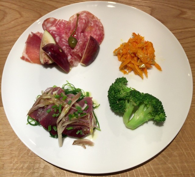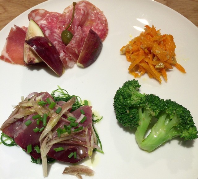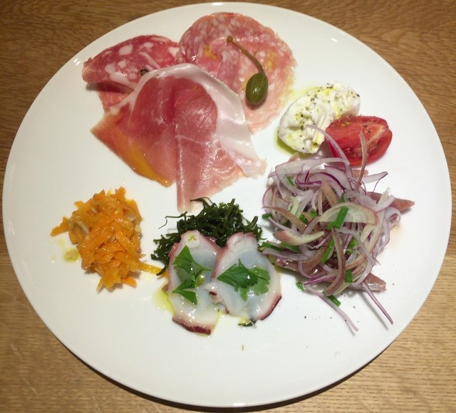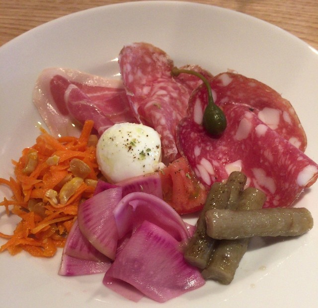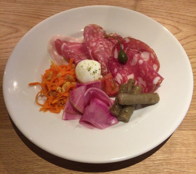 生ハム + 黒胡椒入りサラミ + (水牛の)モッツァレラチーズ + 田舎風のテリーヌ