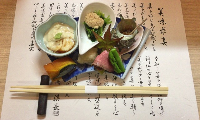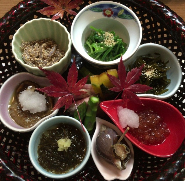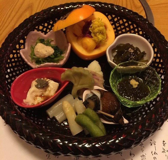八寸(上から時計回りに、せり浸し、昆布佃煮、イクラ正油漬け、磯つぶ時雨煮、水雲酢、滑子おろし、子和えコンニャク、ブロッコリー青煮、かもロース、アスパラガス、すっぽん南瓜)