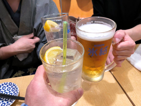 お店に着いた時点で1人遅れるという連絡がありましたので、とりあえず3人で呑んで待つことになりました。