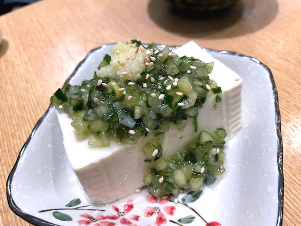 豆腐半丁に、ザーサイ、刻みねぎ、白胡麻が乗り、胡麻油がかけてあります。