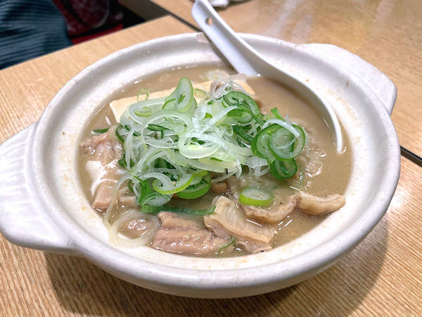 豚の白モツと豆腐を上品な白味噌スープで煮込んでいます。