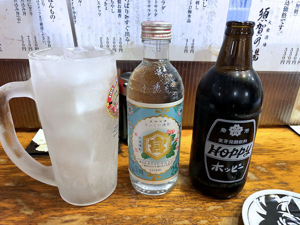 ここは割り材のホッピー(瓶)と焼酎を別々に注文するスタイル。