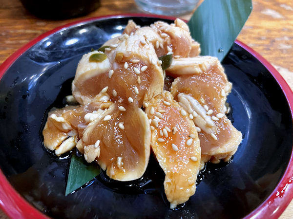 軽く湯がいた鶏ささ身を青唐辛子醤油でヅケにしています。